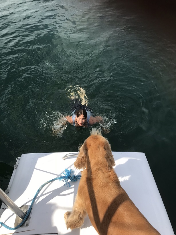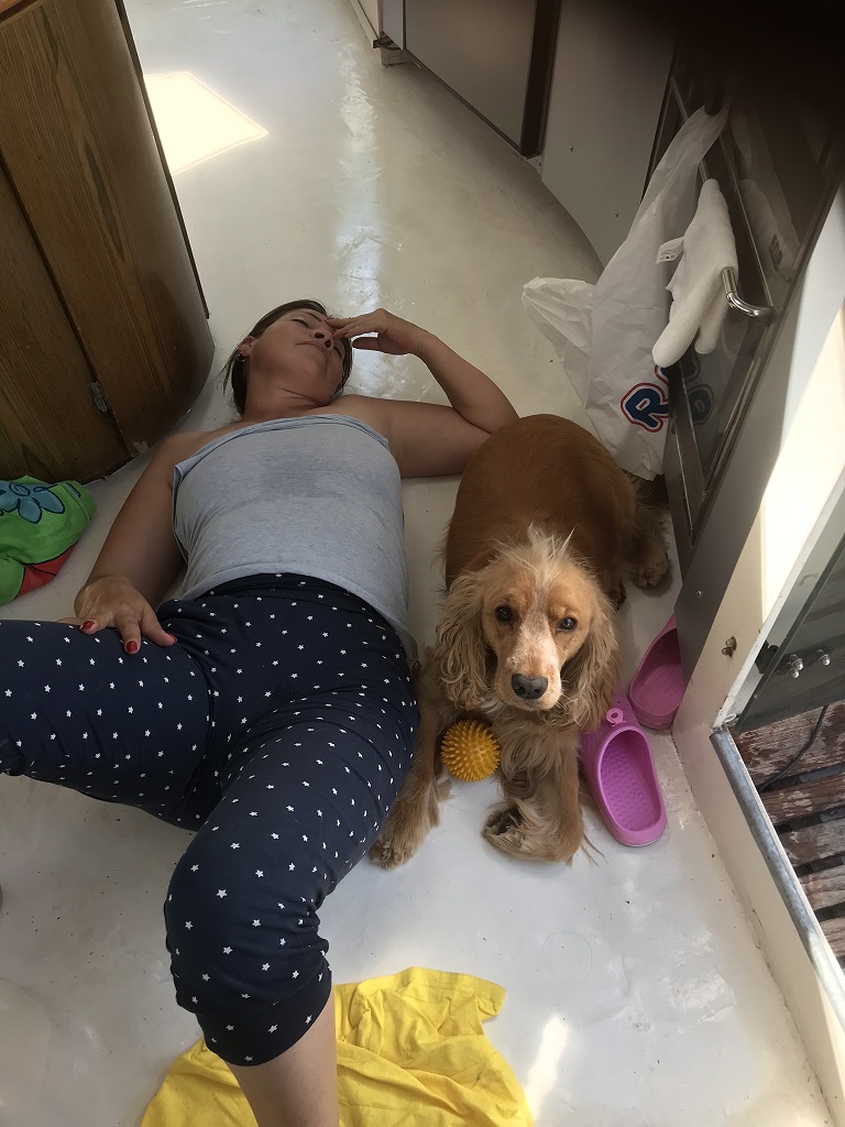 Hot days in July (33o in shadow). Isa and Toby cooling down on the floor. When Isa is swimming, it´s really hot! |